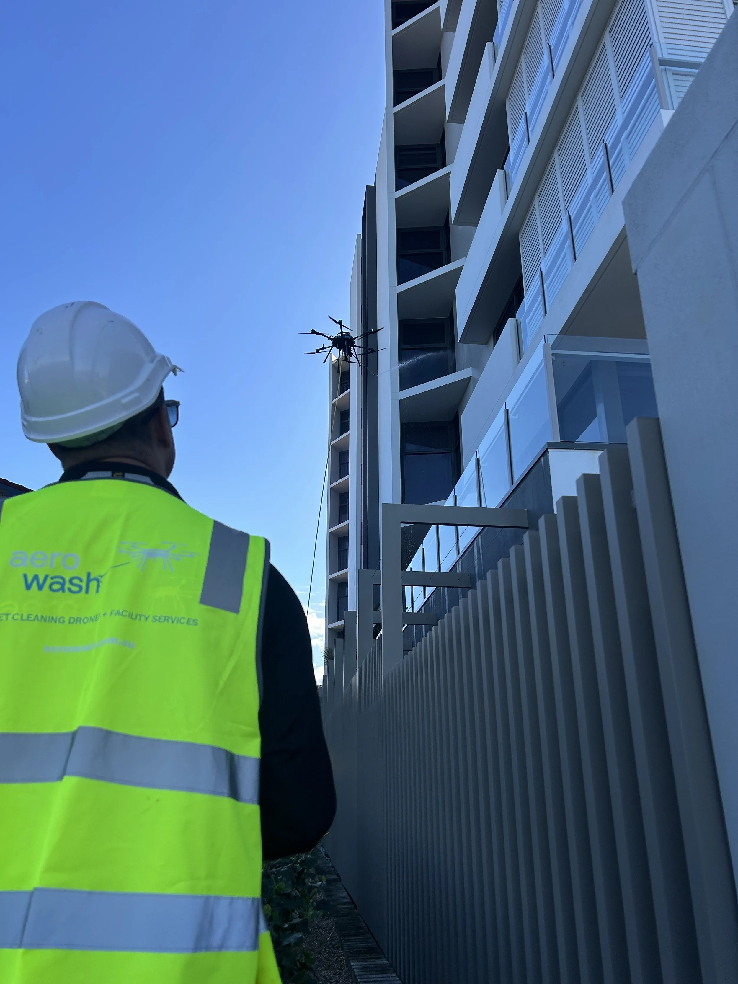 All AeroWash operations are performed by trained, licensed and insured drone operators who follow approved work practices and comply with Civil Aviation Safety Authority requirements. Each project begins with a site assessment to ensure a safe workflow and appropriate cleaning methods.